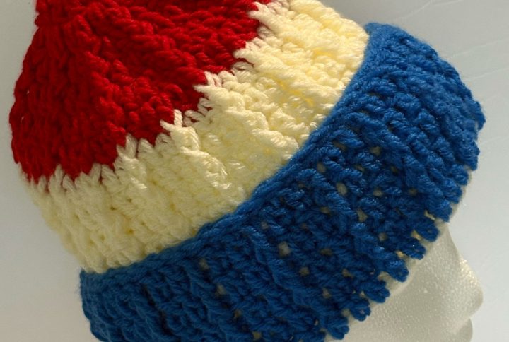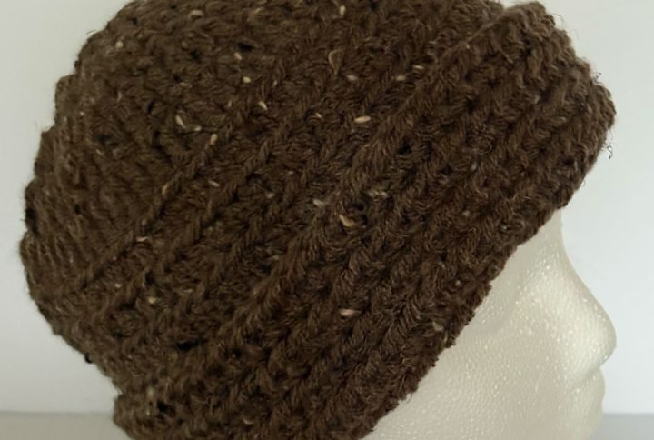 Shades of blue and brown with multi colored speckles. Ribbed
