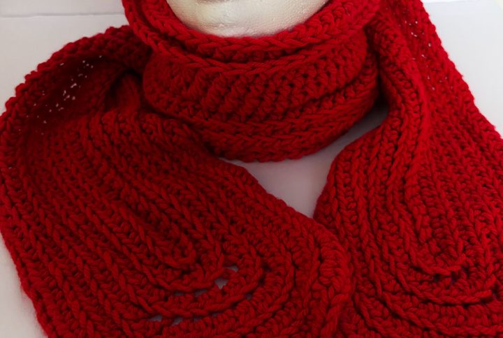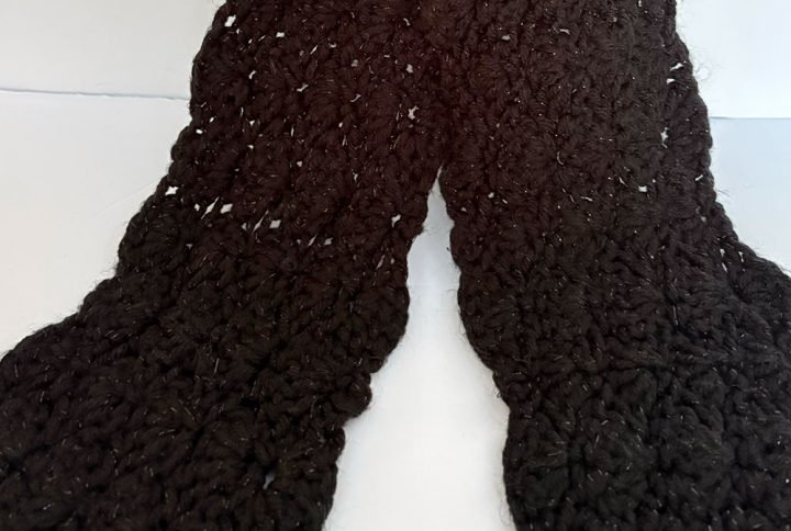 7” wide x70” long. Caramel with gold sparkles. Open weave with puff stitches