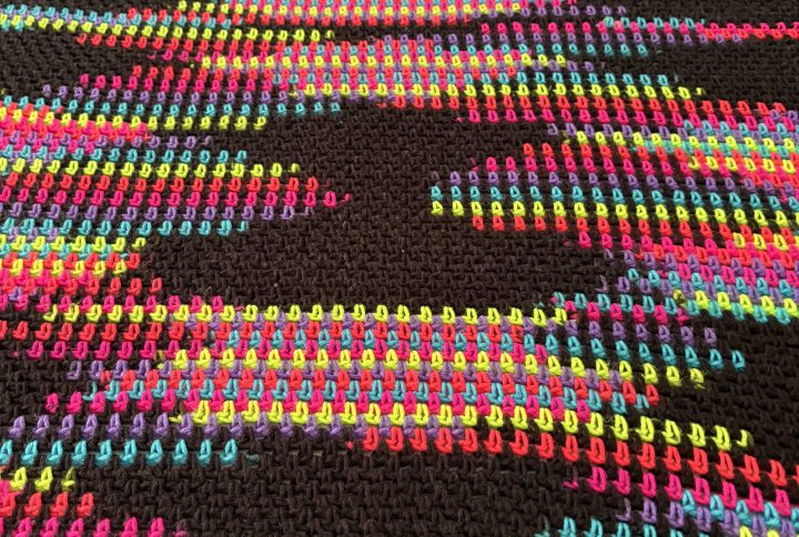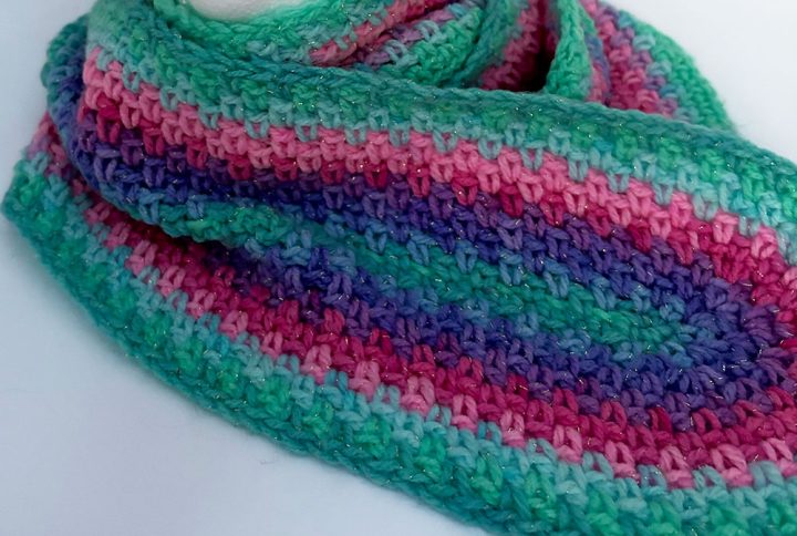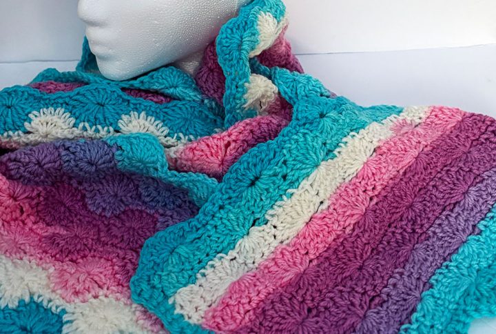 4 1/2” wide and 80” long. Navy, white, and gold. Single interlocking stitches