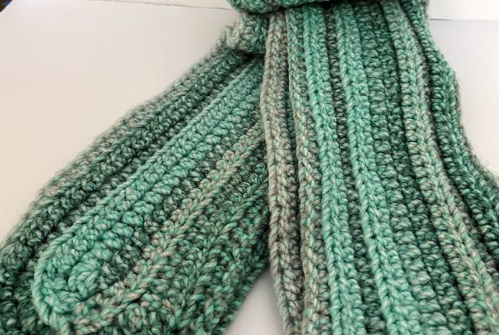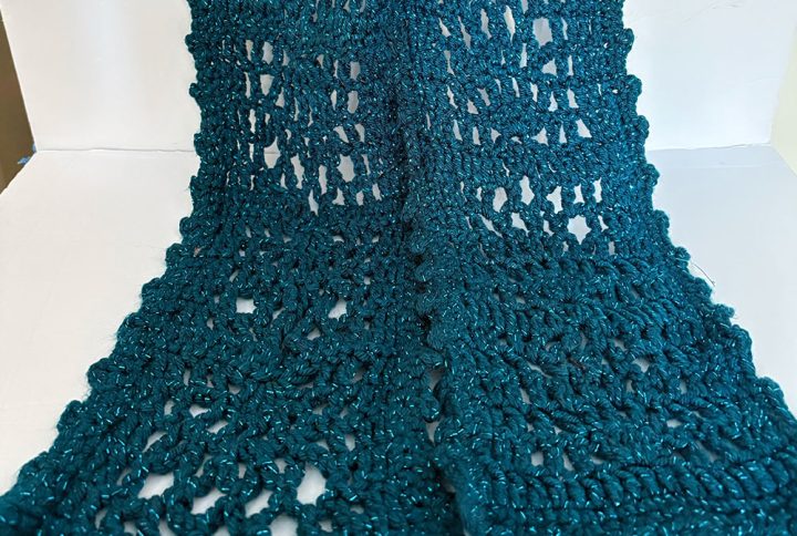 7” wide x 60” long. Bright red with sparkle threads throughout. Shell stitch with scalloped edges