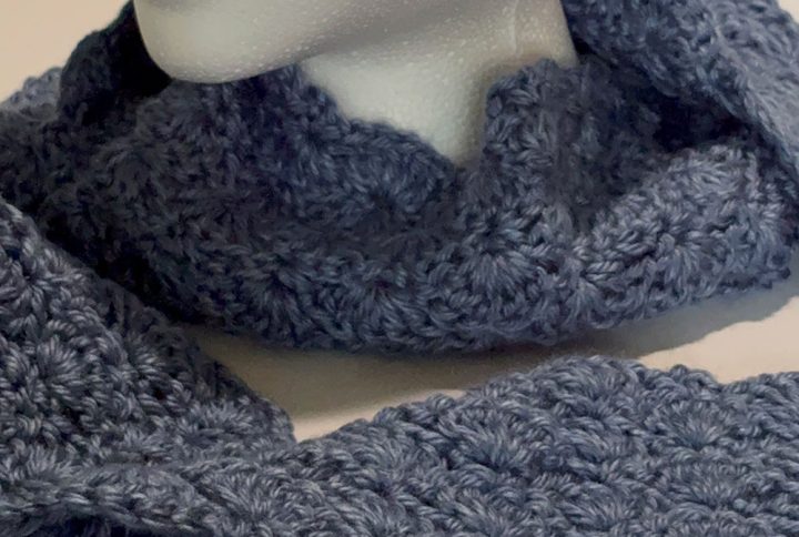 4” wide and 70” long. Cornflower blue. Fan pattern